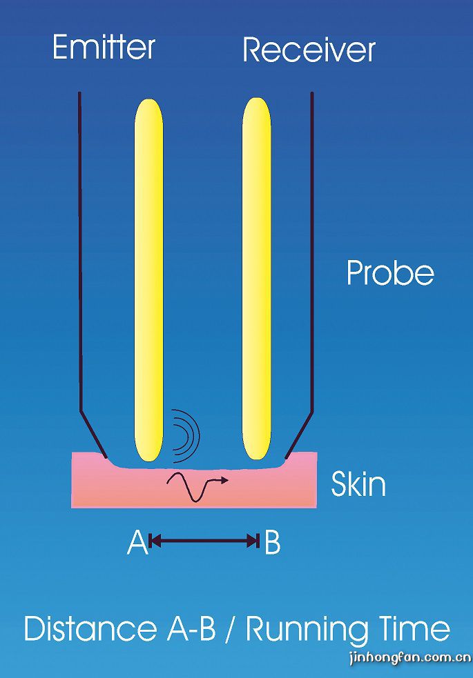 測試原理是基于共振聲波傳播時(shí)間的測量。測量時(shí)探頭內(nèi)部的兩個針狀傳感器放置于被 測皮膚表面,一個傳感器發(fā)出一個聲音沖擊波信號,另一個傳感器接收此聲音沖擊波信號。 由于皮膚表面的水份和彈性的不同,造成聲音沖擊波傳播的速度不同,傳播的時(shí)間也不同。 這樣就可以測出在不同的皮膚水份和彈性狀況下聲波的傳播時(shí)間。彈性越好、水份充足、皺 紋少的皮膚,其傳播時(shí)間就越短。反之,彈性越差、缺水、皺紋多的皮膚,其傳播時(shí)間就越 長。在同一個皮膚位置的不同方向進(jìn)行測試,還可以判斷出皮膚的纖維組織方向。