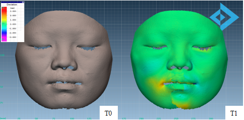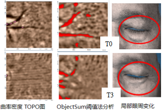 2. 評估:可評估全臉或局部皮膚的皺紋,幅度、體積、面積、深度、周長、皺紋密度、進行目標區域的提取,3D偏差比較等。